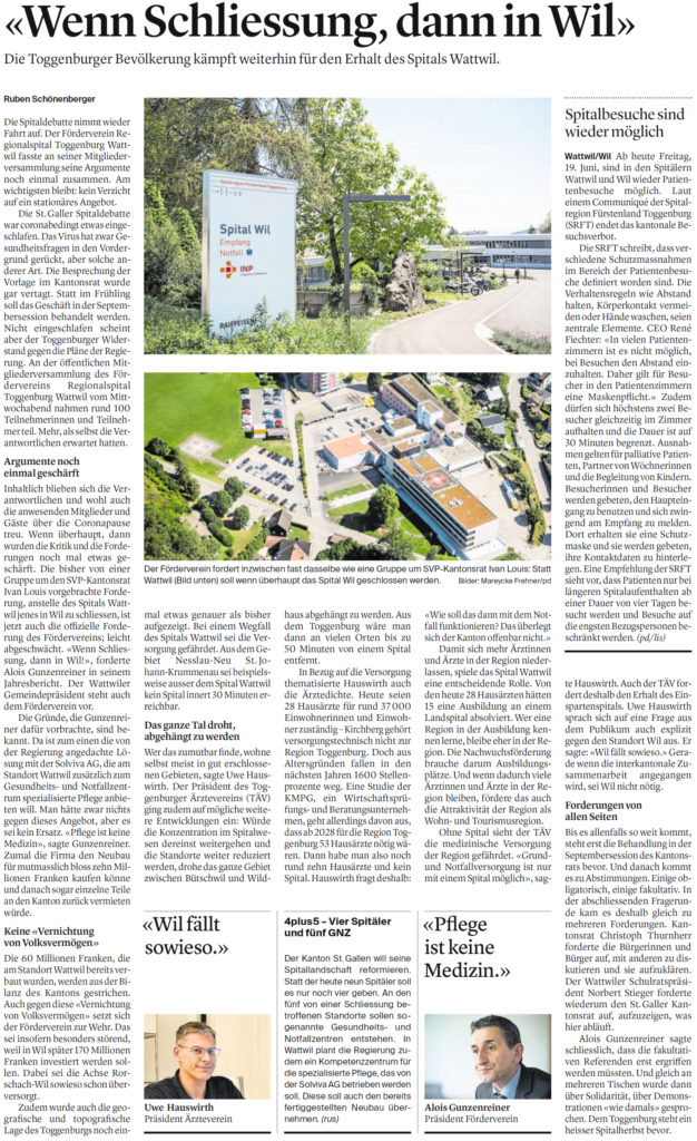 Aufgrund des vehementen Einsatzes der Bevölkerung, der Gemeinde Wattwil und des Toggenburger Ärztevereins konnte zusammen mit der Berit Klinik trotz vieler Hürden ein gut funktionierendes Gesundheits- und Notfallzentrum realisiert werden. Mit der Berit Klinik hat das Toggenburg einen zuverlässigen Partner gefunden, der innert weniger Monate eine qualitativ hochstehende medizinische Notfallversorgung rund um die Uhr an 365 Tagen pro Jahr auf die Beine gestellt hat. Inzwischen werden auch diverse medizinische und diagnostische Leistungen (Radiologie, Sonographie, CT, Labor) und Spezialsprechstunden im ehemaligen Spitalgebäude angeboten. Zudem wird das medizinische Spektrum im August 2024 mit Hausarztpraxen und zusätzlichen Spezialfachärztinnen und -Ärzten ausgebaut. Somit entwickelt sich zusammen mit den Grundversorgern und Spezialärzten des Toggenburger Ärztevereins wieder ein äusserst potentes Netzwerk, welches auch über das Toggenburg hinaus ein Modell sein könnte.